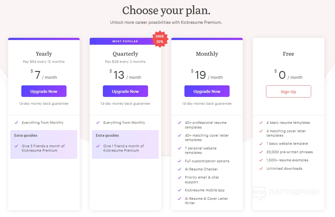 Ежеквартальный план (12 долларов в месяц, оплата каждые 3 месяца) включает все функции ежемесячного, а также возможность подарить 1 другу месяц Kickresume Premium.