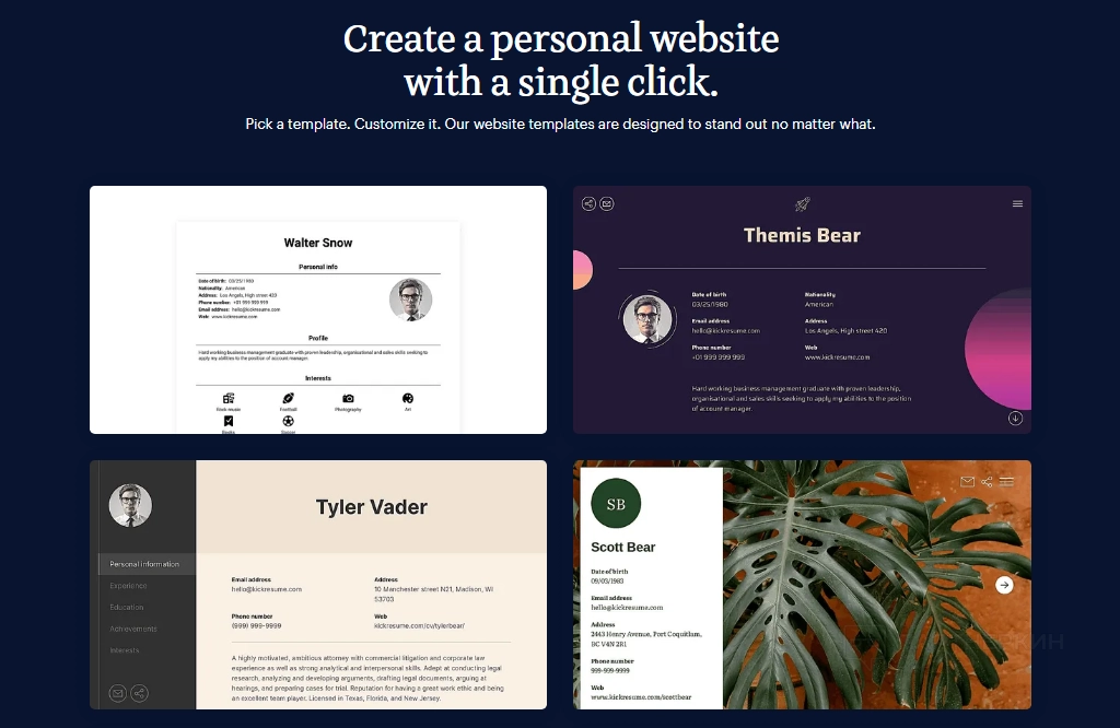 - О нас . В этом разделе предоставлена информация о компании Kickresume, ее миссии и истории.