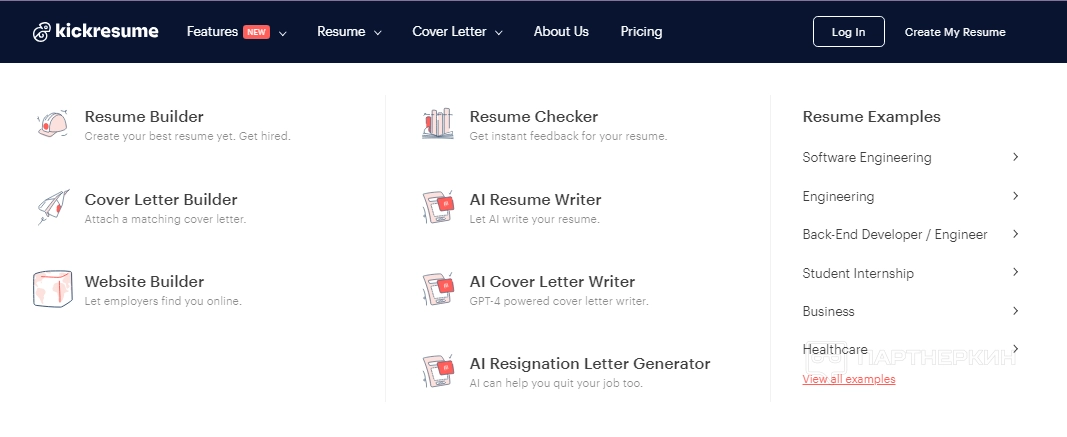 - Функции . В данном разделе пользователи могут ознакомиться с широким спектром возможностей сервиса. Kickresume предлагает использование искусственного интеллекта для создания и улучшения резюме.