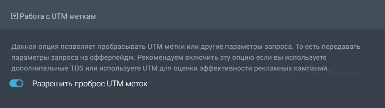 Работа с UTM метками. С помощью этой функции пользователь может пробрасывать UTM метки или другие параметры запроса. Опция пригодится клиентам, которые используют дополнительные TDS или UTM для оценки эффективности рекламных кампаний.