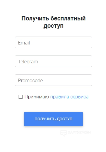 Площадка предложит три дня бесплатного доступа. В течение этого времени пользователю будет доступен полный функционал без ограничений. В появившемся окне необходимо указать адрес электронной почты, аккаунт в Telegram, промокод (при наличии), поставить галочку «Принимаю правила сервиса» и нажать «Получить доступ».