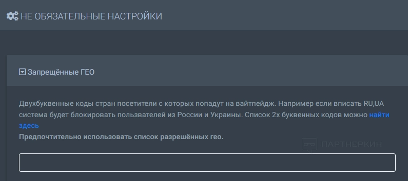 Запрещенные ГЕО . Двухбуквенные коды стран, посетители с которых попадут на «вайт-пейдж». Если пользователь укажет RU, то система будет блокировать посетителей из России.