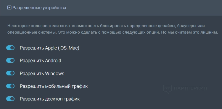 Разрешенные устройства. По умолчанию трафик разрешен со всех устройств. Если пользователь захочет заблокировать определенные девайсы, браузеры или операционные системы, он может их отключить. Однако этого делать не рекомендуется.