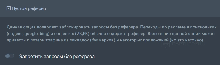 Пустой реферер. Реферер — это URL домена, с которого осуществлялся переход. Включенная функция позволяет заблокировать запросы без реферера, однако опция может привести к потере трафика из закладок и некоторых приложений.