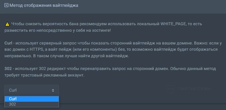 Метод отображения вайт-пейджа. Клиент может применить два метода отображения — Curl или 302. Первый использует серверный запрос, чтобы показать сторонний «вайт-пейдж» на домене пользователя. Второй перенаправляет запрос на сторонний домен.