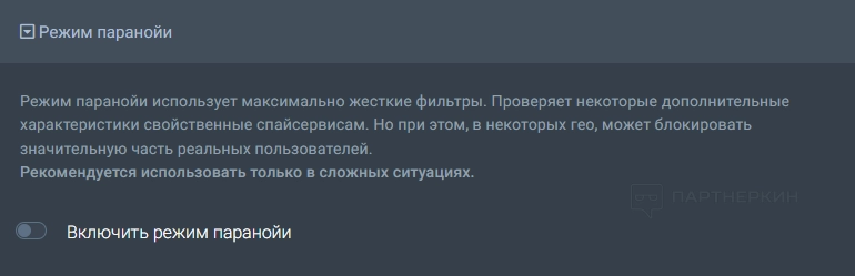 Режим паранойи. Включенная опция использует жесткие настройки фильтрации и проверяет некоторые дополнительные характеристики, свойственные spy-сервисам.