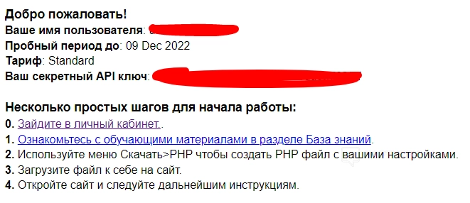 На электронную почту придет письмо, в котором система сгенерирует логин и секретный API ключ.