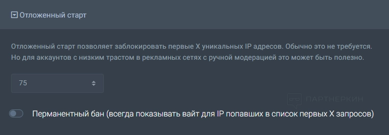 Отложенный старт. Функция позволяет заблокировать первые Х IP-адресов. Опция может быть полезна для аккаунтов с низким трастом в рекламных сетях с ручной модерацией. Если клиент выставит значение «75», то первые 75 пользователей будут отправлены на «вайт-пейдж».