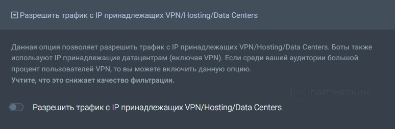 Разрешить трафик с IP принадлежащих VPN/HOSTING/Data Centers. Опцию рекомендуется включить пользователям, чья целевая аудитория в основном пользуется VPN. Этот параметр снижает качество фильтрации.