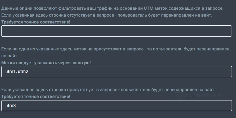 - Опциональные UTM метки. В этом поле юзер может через запятую указать метки — например, utm1, utm2. Если ни одна из указанных UTM меток не будет присутствовать в запросе, посетителя перенаправит на «вайт-пейдж».
