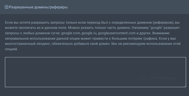 Разрешенные домены/рефереры. Функция используется в тех случаях, если пользователь хочет разрешить запросы, которые были совершены с определенных доменов. Например, «Google» разрешит запросы с любых доменов поисковой системы: google.com, google.ru и другие.