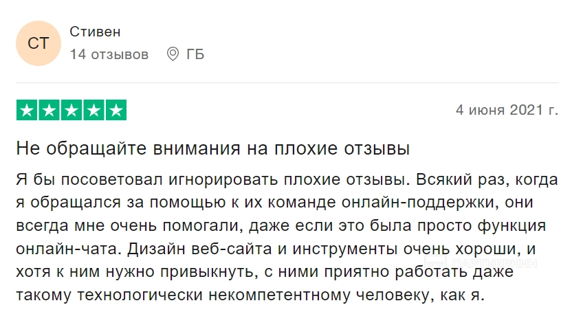 Пользователь по имени Стивен доволен работой технической поддержки. По словам клиента, специалисты всегда помогали (даже в самых простых и очевидных вопросах). Ему также понравились дизайн веб-сайта и представленные инструменты.
