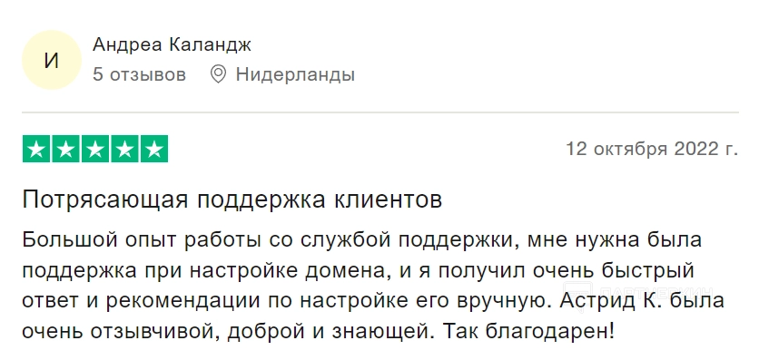 Техническая поддержка — сильная сторона платформы. Это также подтверждает отзыв пользователя Андреа — специалисты помогли быстро настроить домен.