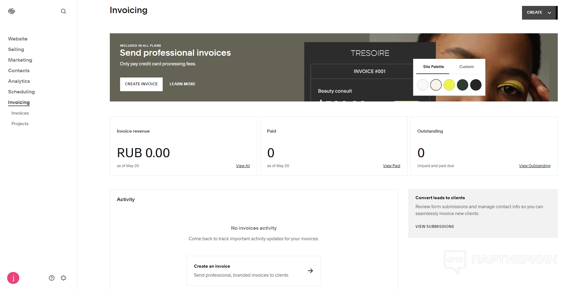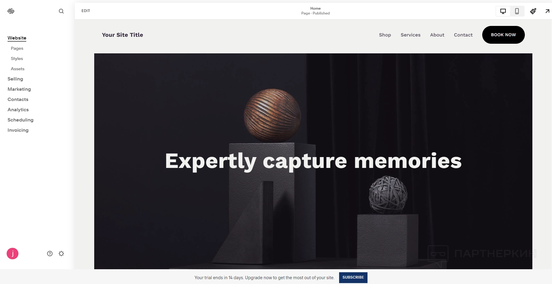 Веб-сайты оптимизированы для мобильных устройств Бесплатный домен (при покупке тарифа на год Squarespace предоставляет один бесплатный домен) Возможность принимать платежи от клиентов Комиссия за транзакцию составляет 9% |