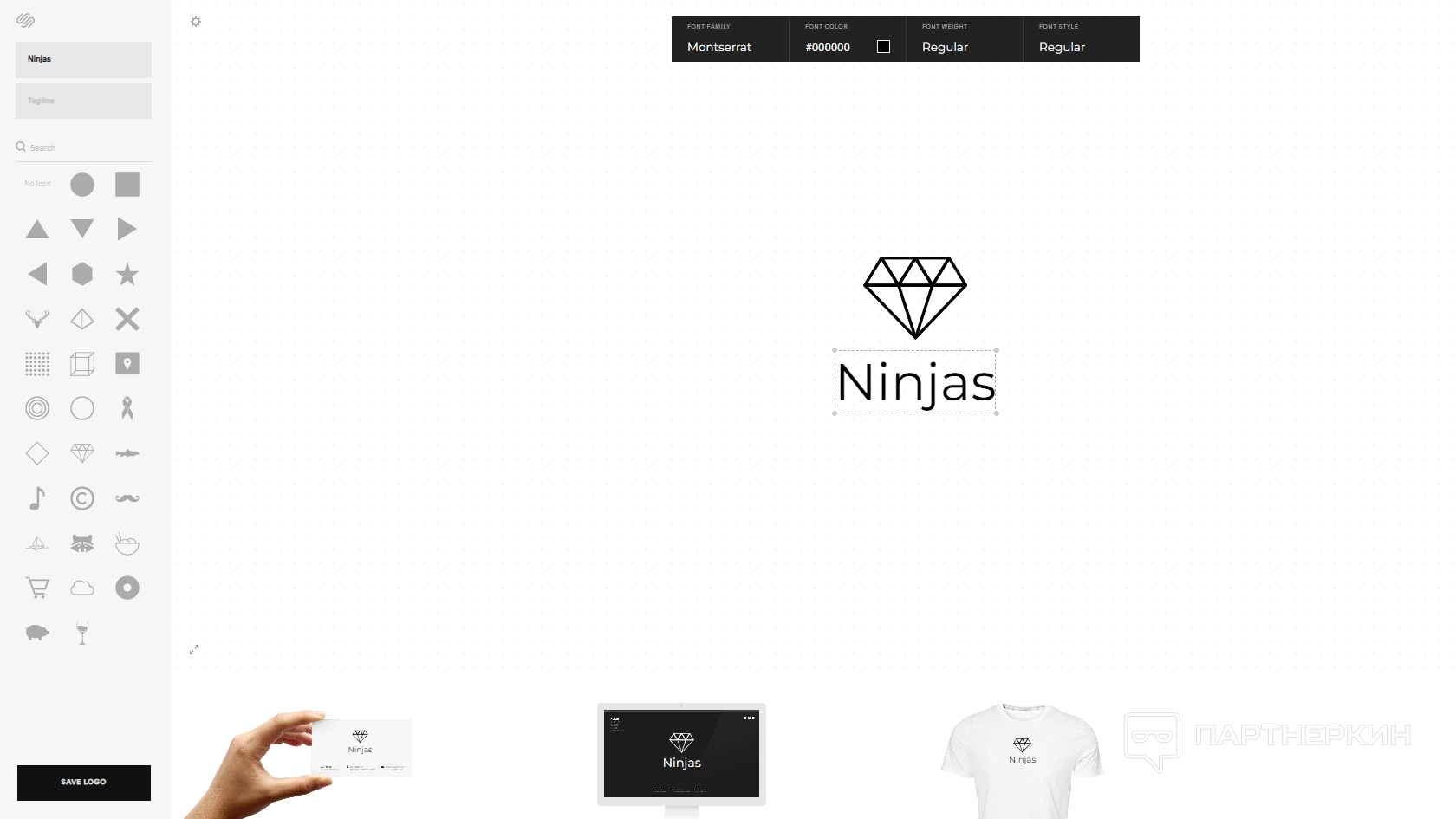 Откроется панель инструментов с выбором иконок. Ниже можно посмотреть, как будет выглядеть логотип на визитке, мониторе и футболке.