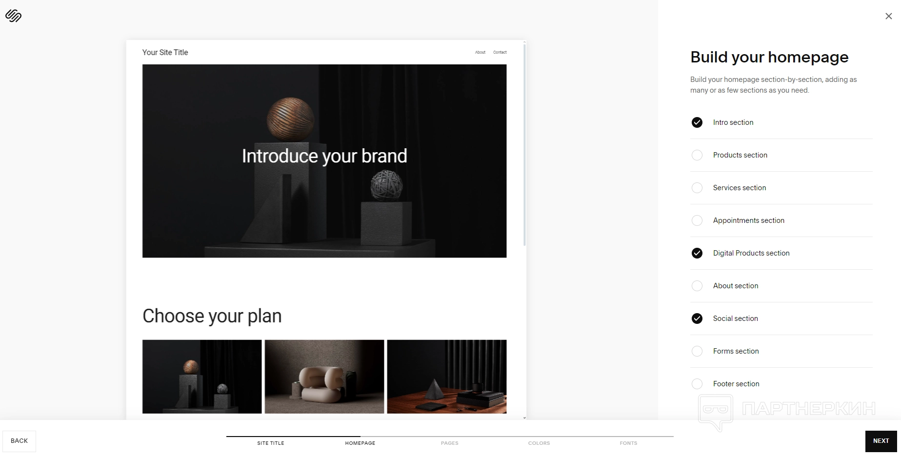 Homepage . Создайте домашнюю страницу. Добавьте любое количество разделов на сайт. Для примера выберем Intro section, Digital Products Section и Social section.