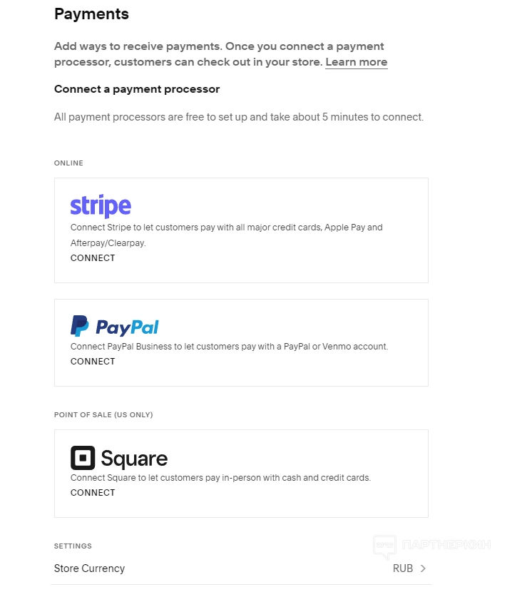 Payments . Покупатели смогут расплачиваться в магазине после подключения платежных систем (доступны Stripe, PayPal и Square).