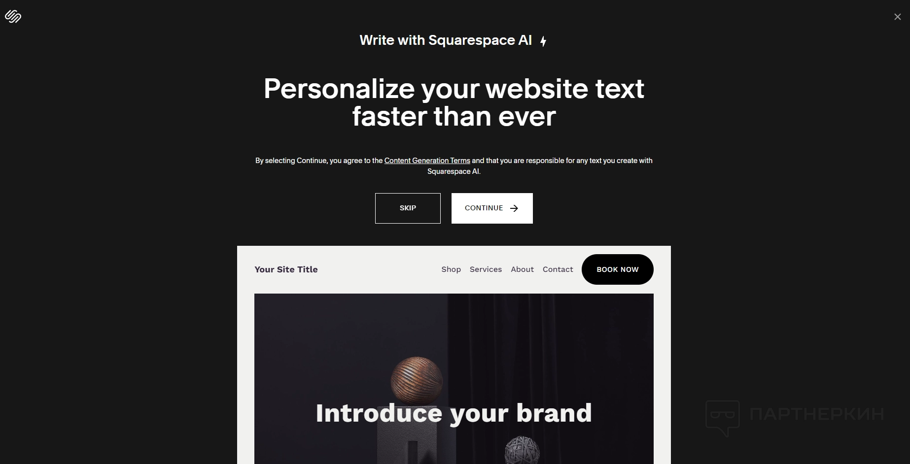 Сервис создал шаблон сайта за 5 секунд. Нажмем Continue (платформа предупреждает, что выбрав «продолжить», мы будем нести ответственность за любой контент, созданный с помощью Squarespace AI).