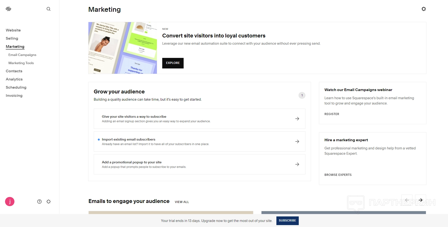 Здесь пользователь управляет маркетинговыми кампаниями по электронной почте и запускает рекламные материалы. Сервис предлагает три способа для расширения своей аудитории:
