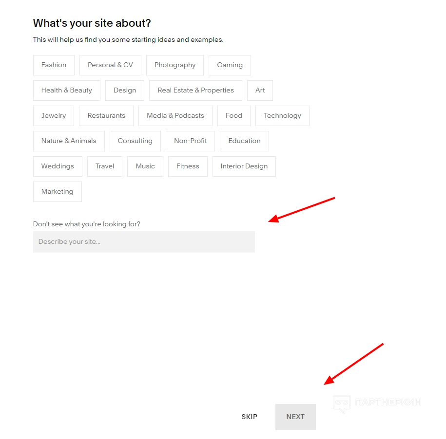 Откроется страница, где нужно выбрать, какой теме будет посвящен сайт — моде, фотографии, играм, дизайну, искусству, технологиям и так далее. Если вы затрудняетесь ответить, можно детально описать концепцию ресурса в отдельном поле или пропустить этот шаг.