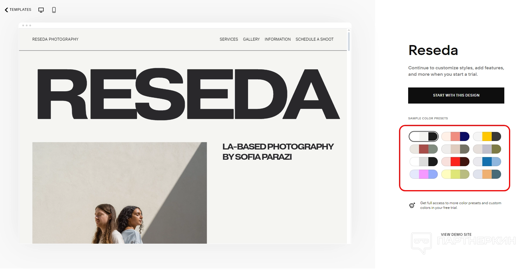 Для теста функций выберем шаблон Reseda (предварительно можно выбрать понравившуюся цветовую палитру).