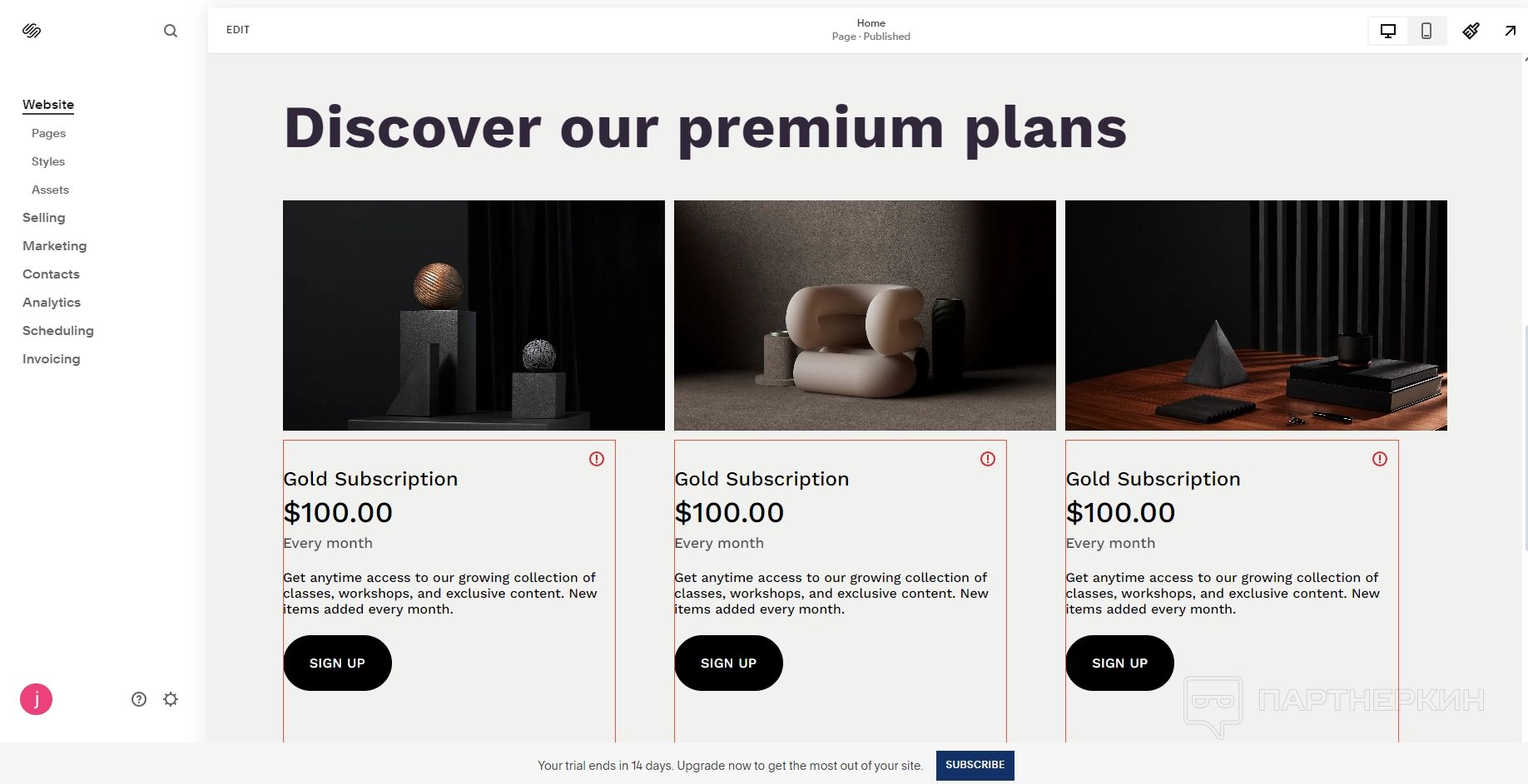 Стоимость тарифов . Не всех пользователей устраивают цены на подписку. Зато у платформы есть 14-дневный бесплатный пробный период. Этого времени достаточно, чтобы разработать несколько сайтов и понять, подходит ли площадка для определенных задач или нет.