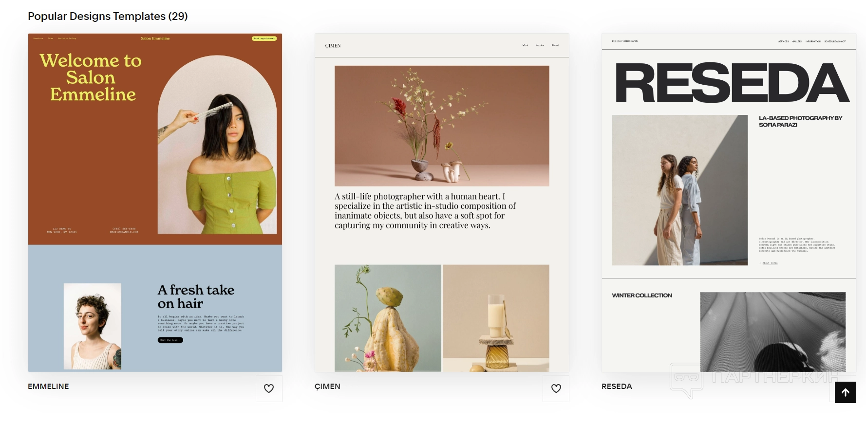 При выборе готовых шаблонов у вас будет более 100 вариантов (по сравнению с другими онлайн-конструкторами это небольшое количество, но разработчики регулярно добавляют новые шаблоны). Также есть возможность создать дизайн сайта с помощью искусственного интеллекта. В обзоре мы рассмотрим оба варианта.
