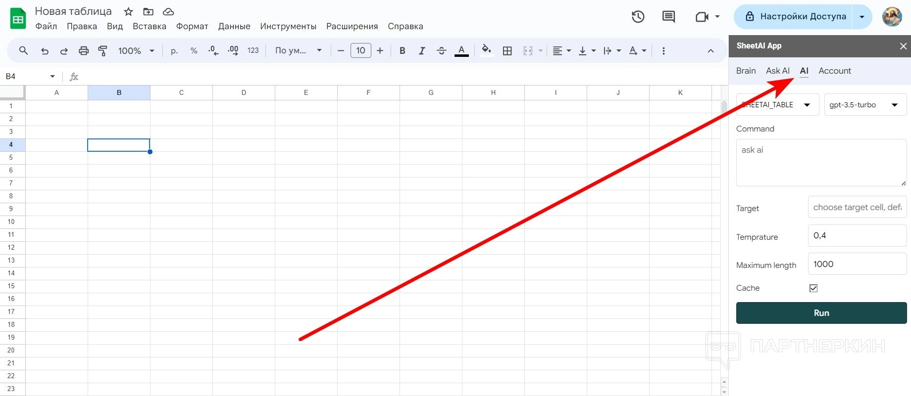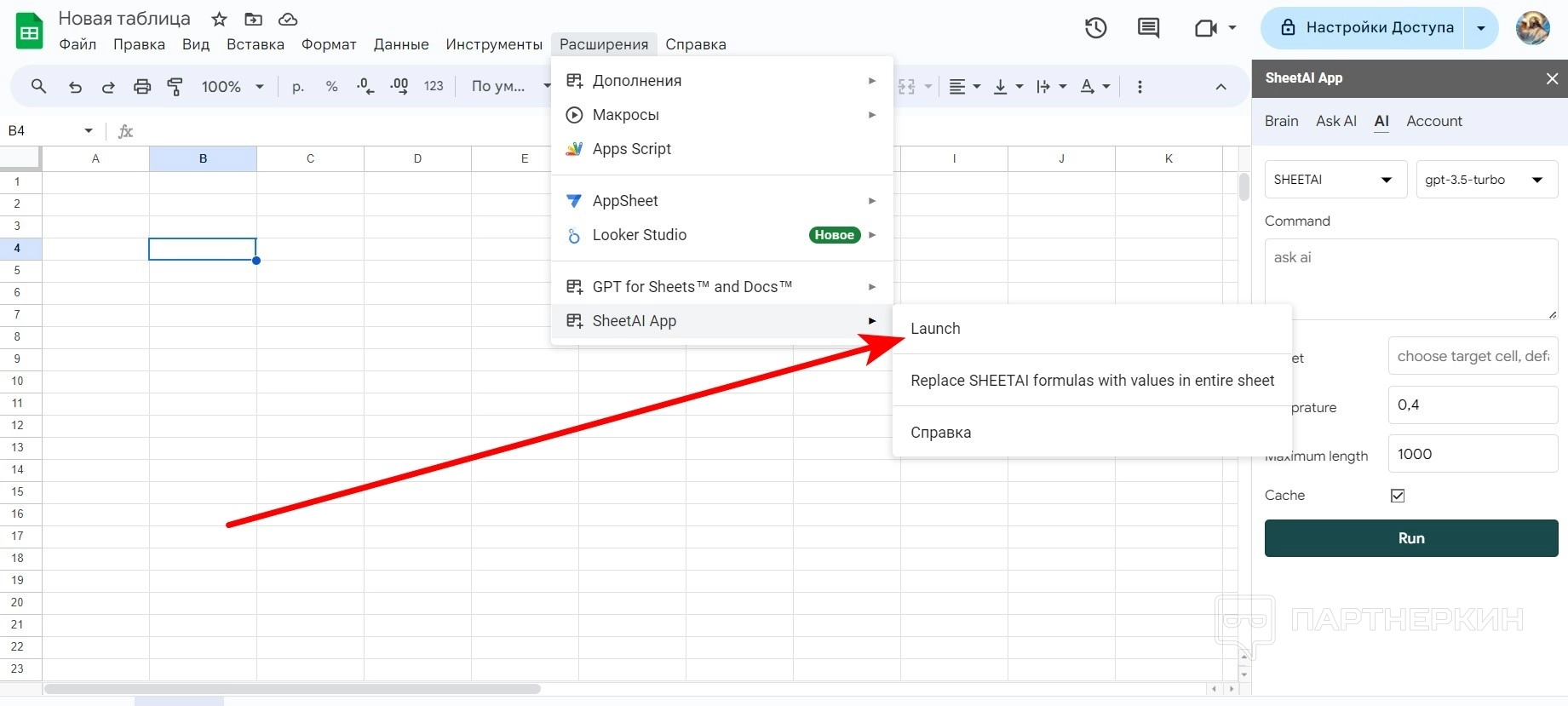 Приложение выглядит довольно компактно. Окно занимает боковое пространство в Гугл-таблицах. Его можно закрыть и снова активировать: Расширения / SheetAI App / Launch.