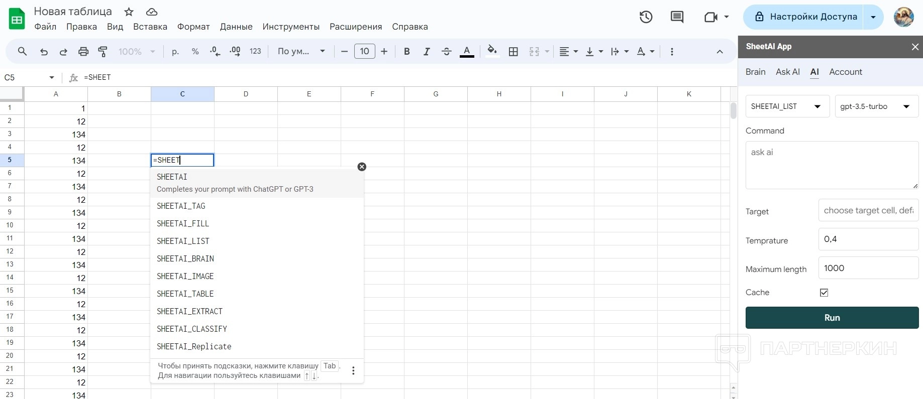 - Доступ ко всем предыдущим вызовам функций SHEETAI.