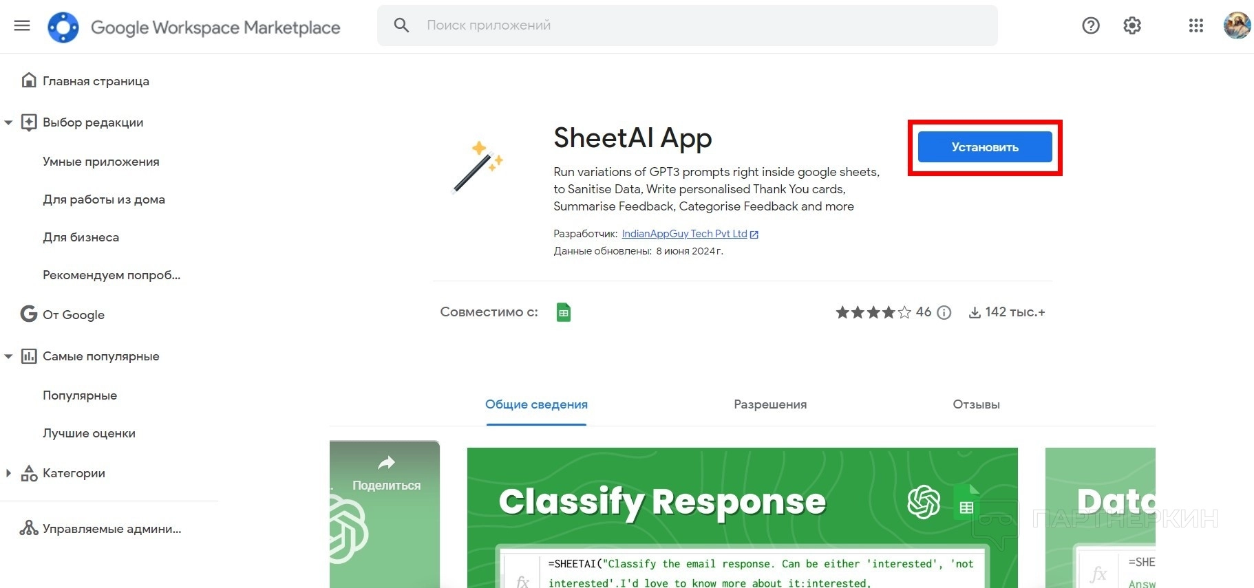 - Система перебросит на страницу Google Workspace Marketplace. Установите приложение, нажав на кнопку «Установить» или «Install».