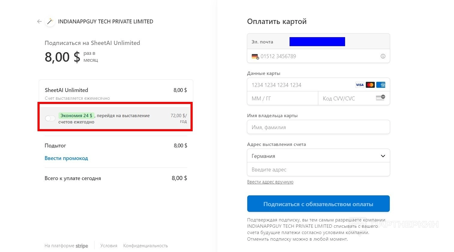- Выберите тип подписки (ежемесячно или ежегодно).