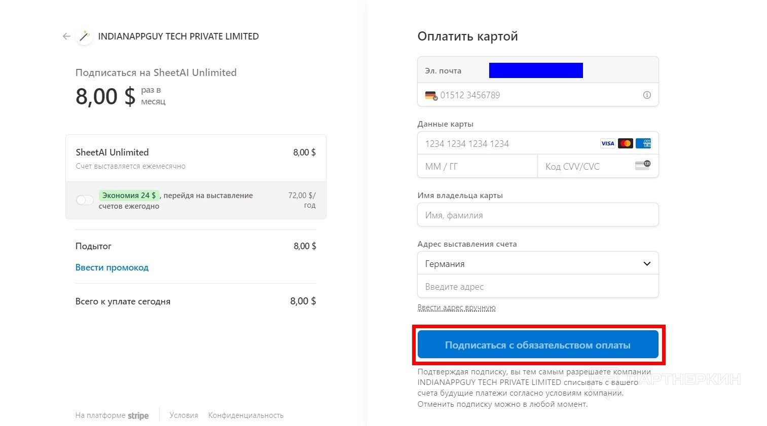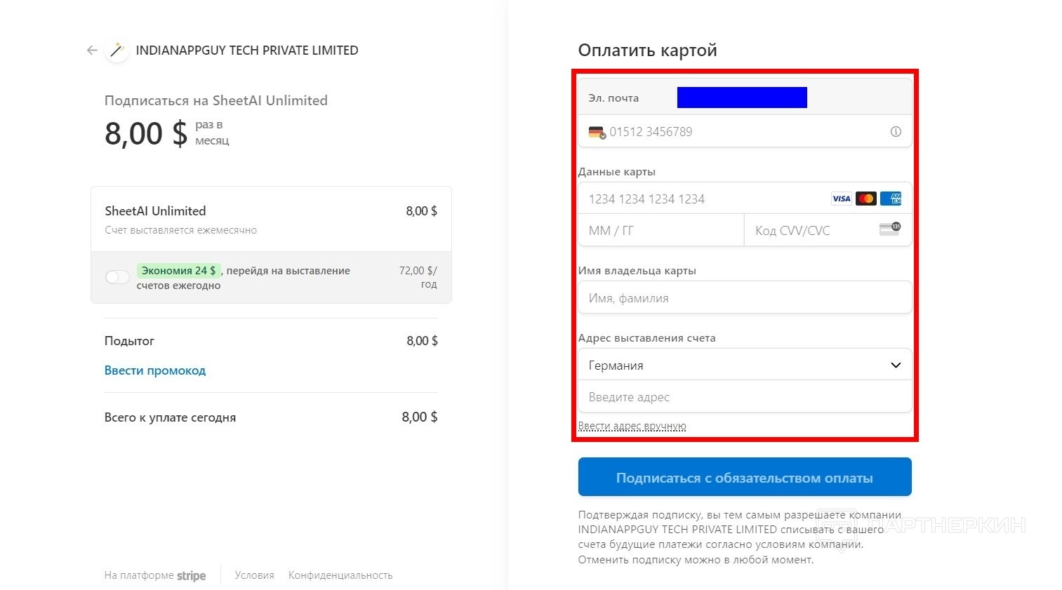 - Заполните форму: номер телефона, данные карты, ФИО, адрес выставления счета.