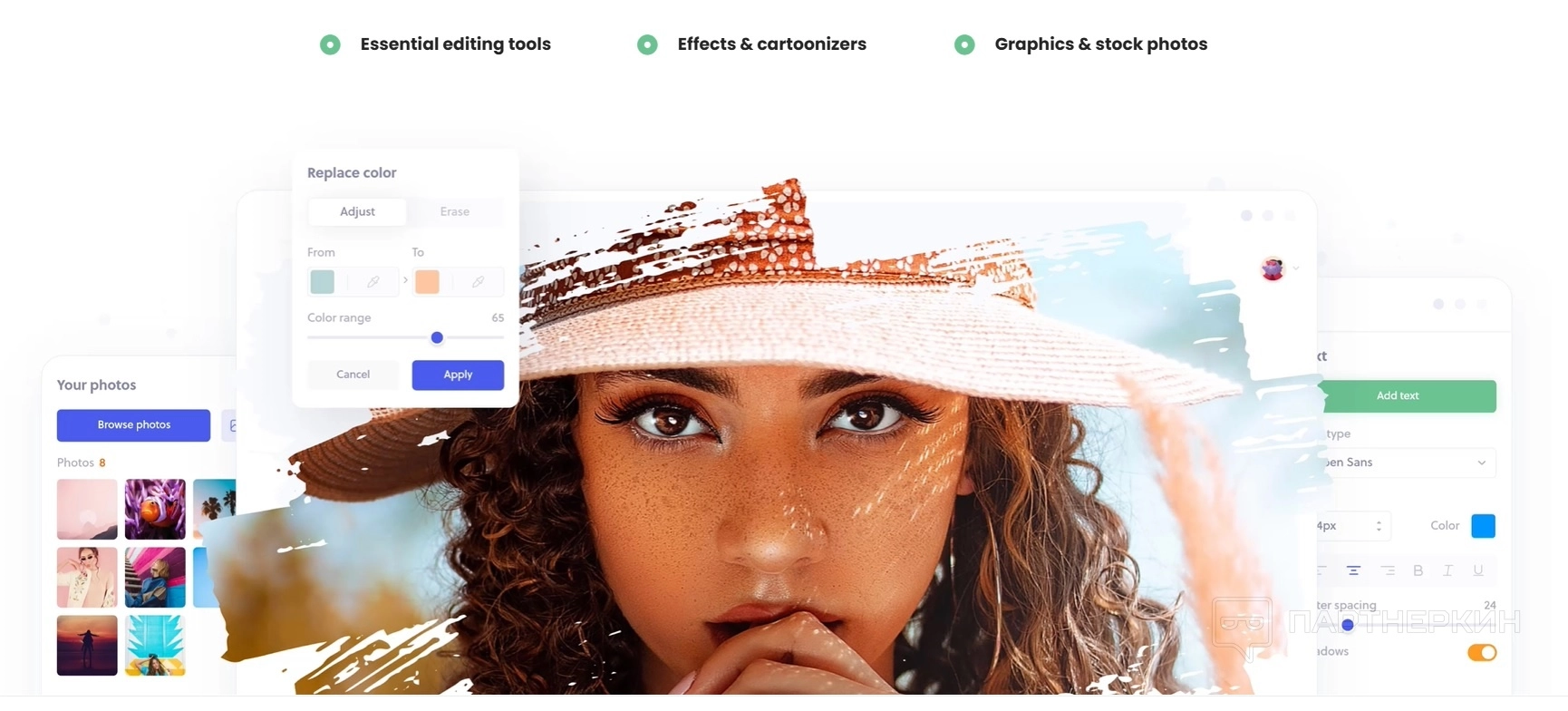 • Многофункциональный фото— и текстовый редактор . Удаление фона, обрезка и изменение размера изображений, настройка или замена цветов — все эти функции доступны в одном сервисе. Это дает полный контроль над процессом редактирования.