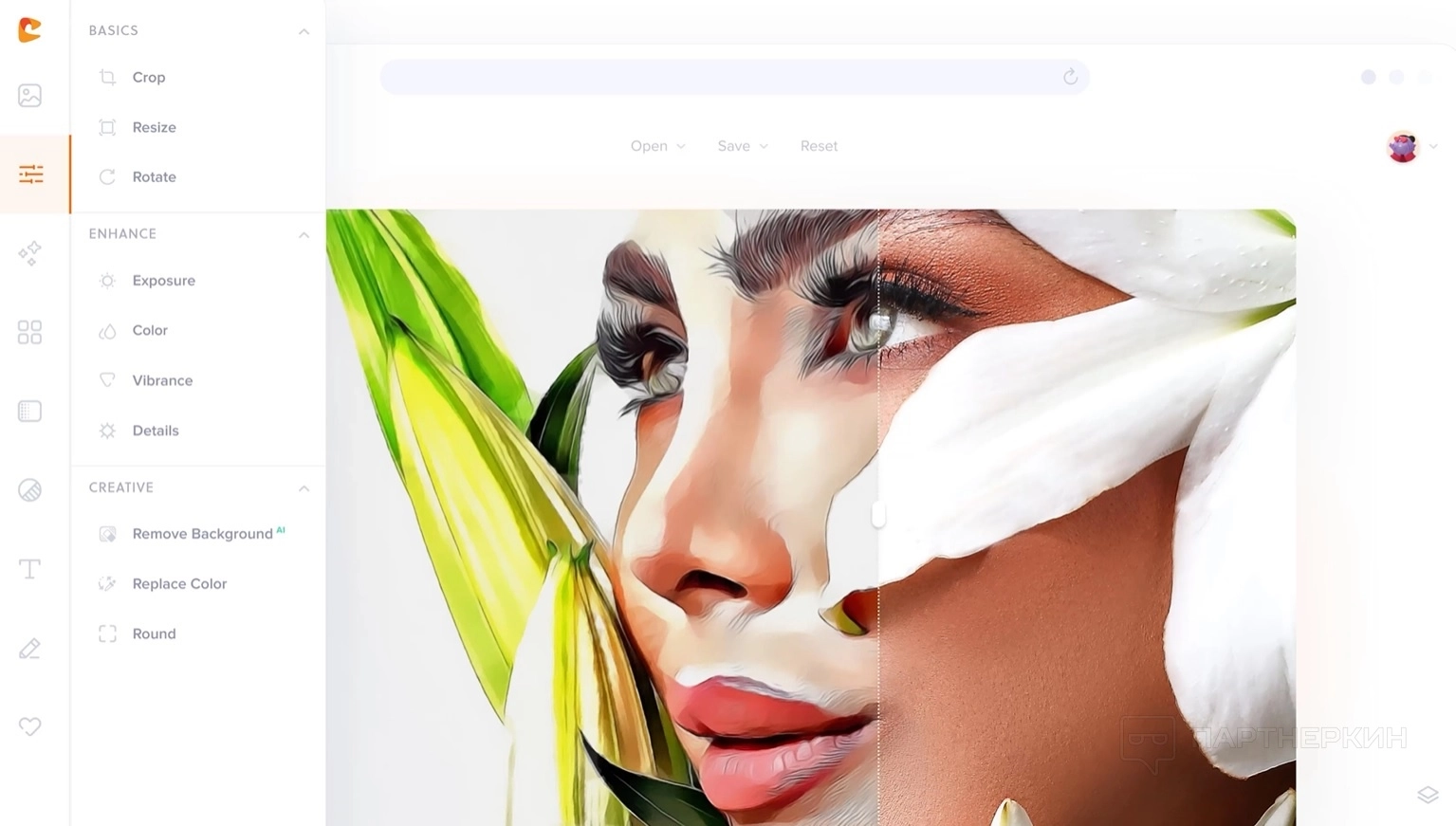 • Интеллектуальное редактирование . Встроенные инструменты на основе искусственного интеллекта позволяют достичь высококачественных результатов при минимальных усилиях. Фоторедактор автоматически применяет оптимальные эффекты.