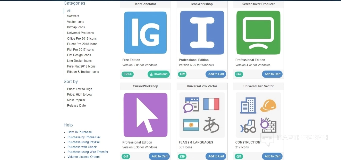 По умолчанию пользователь может просмотреть и скачать до 20 бесплатных иконок в каждом стиле или наборе (в зависимости от последнего), однако все остальные необходимо оплатить. Стоимость таких пакетов варьируется и начинается от €59 в среднем и выше.