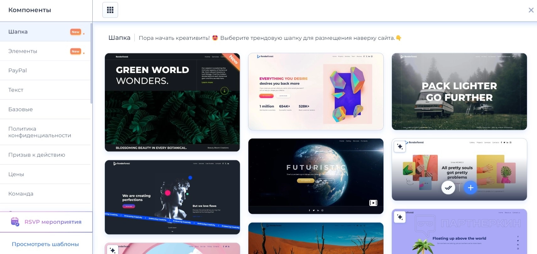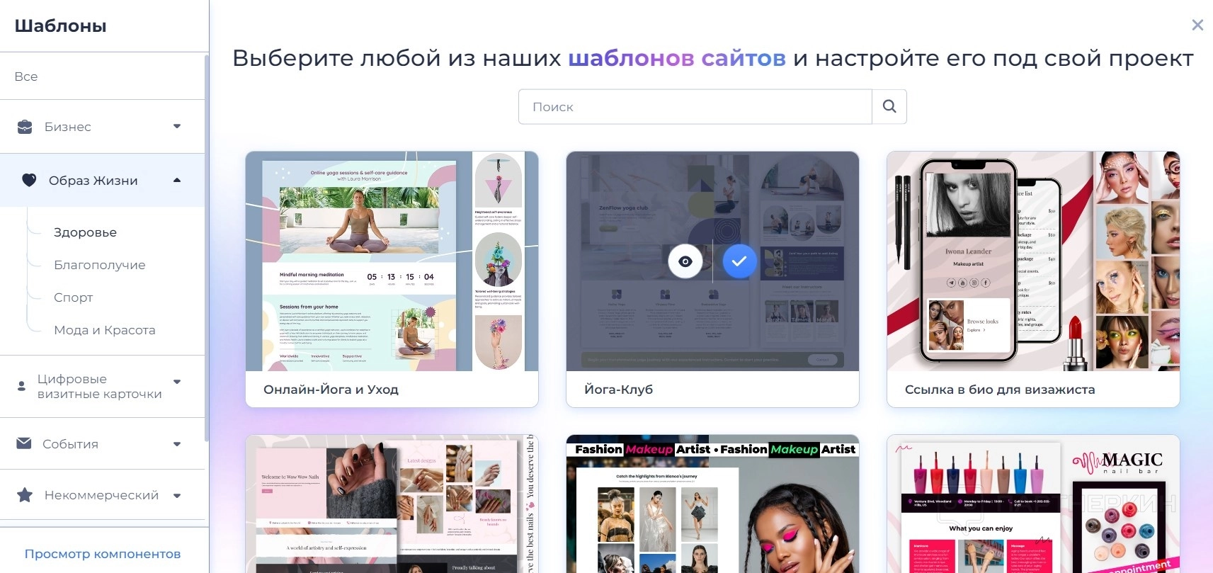 Шаблоны разбиты по категориям. Можно выбрать вариант под конкретное событие, стиль, тематику компании. Например, открытка на свадьбу или сайт для йога-клуба.