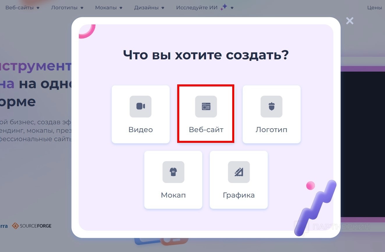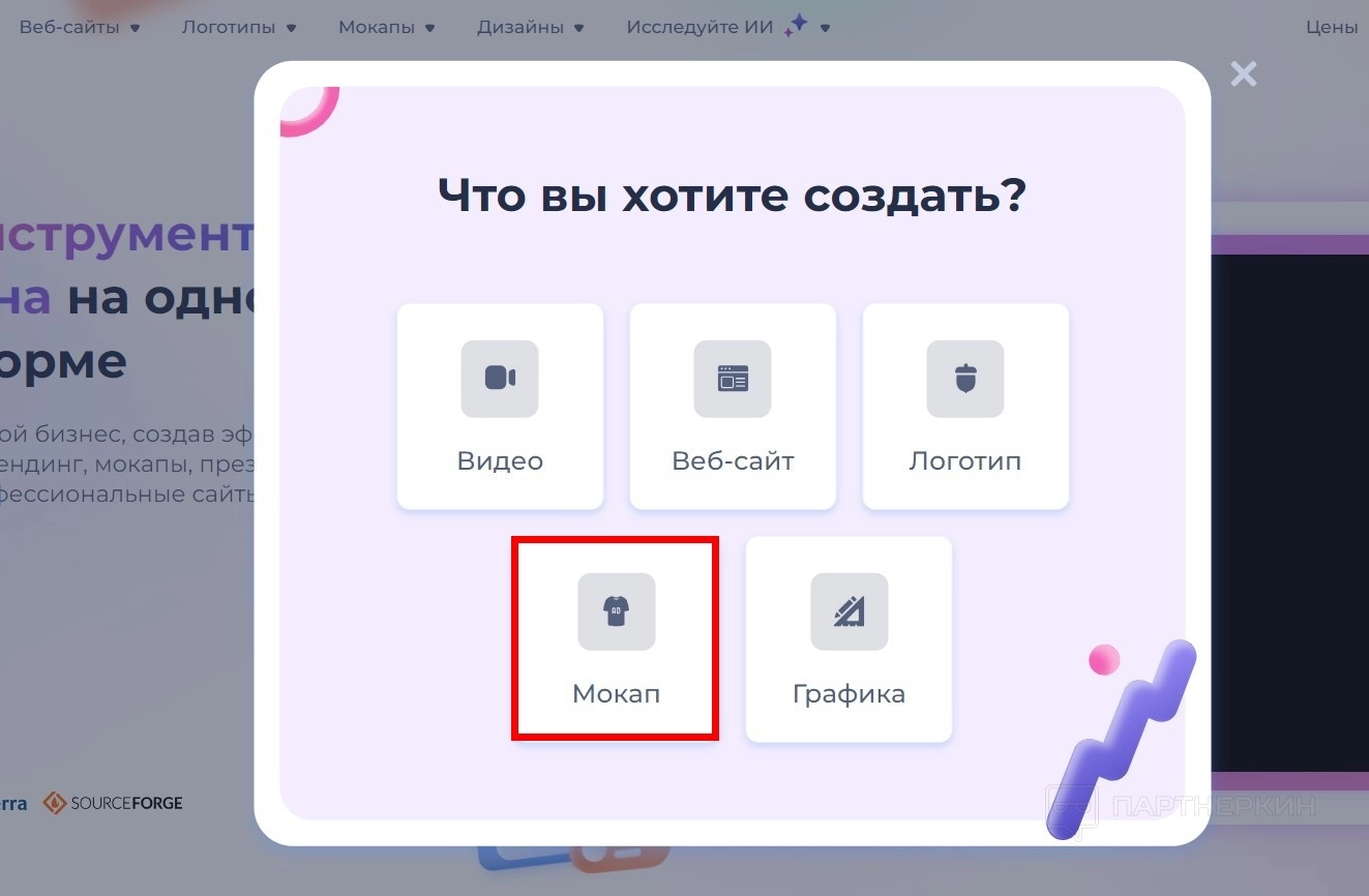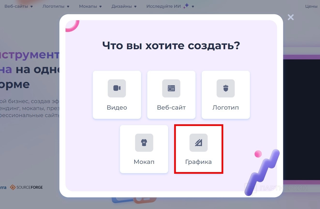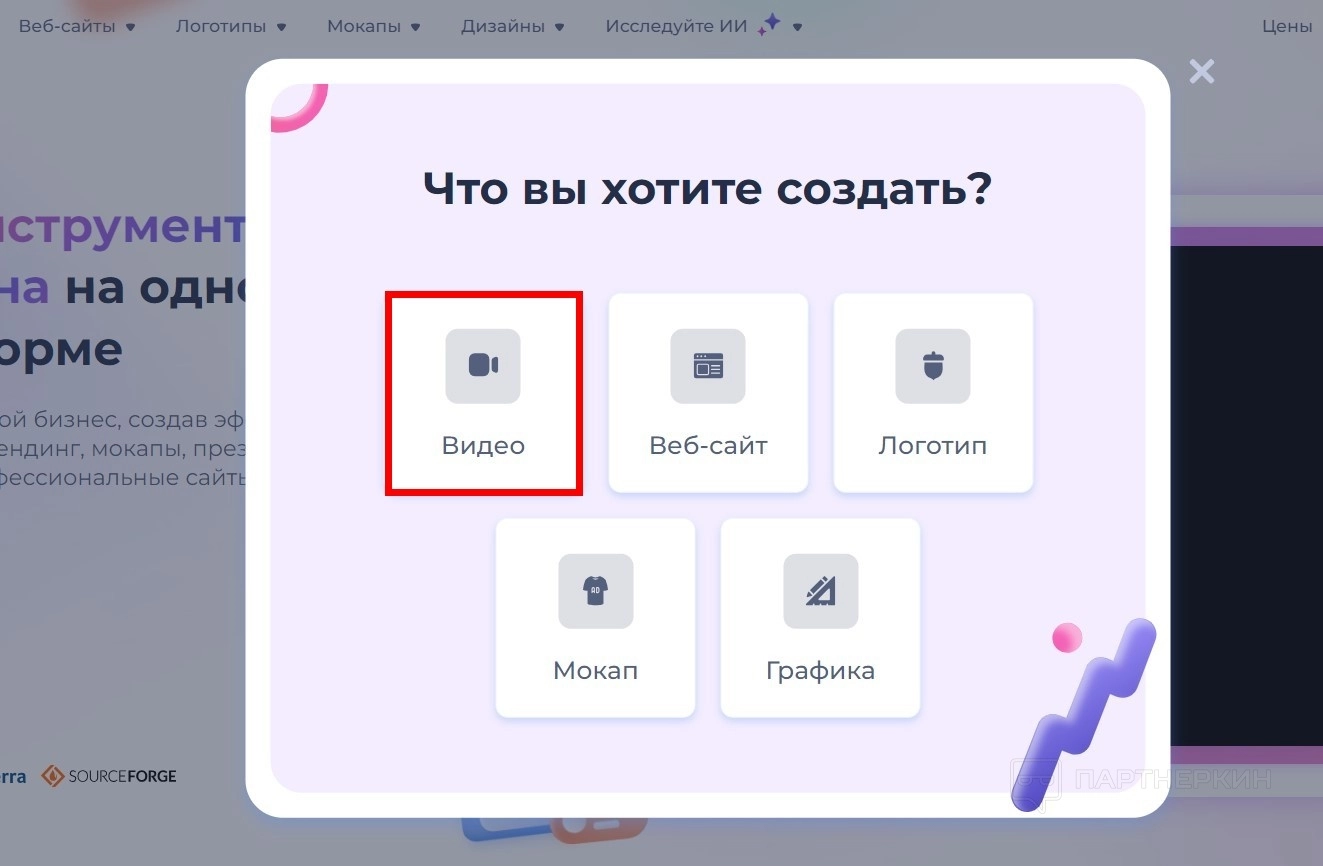 - Список инструментов сервиса: Видео, Веб-сайты, Логотипы, Мокапы, Дизайны, Искусственный интеллект.