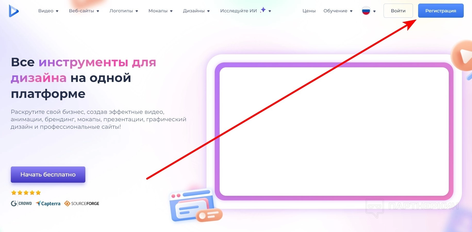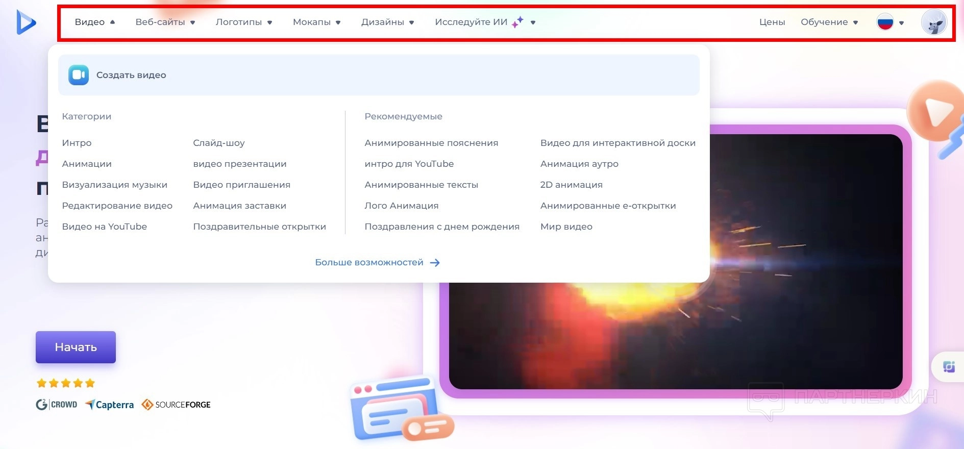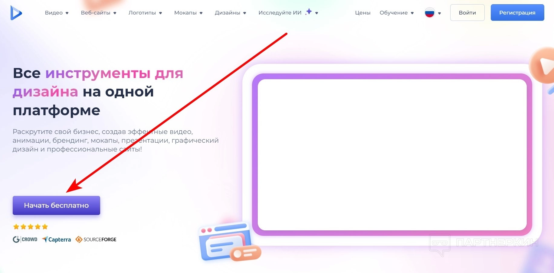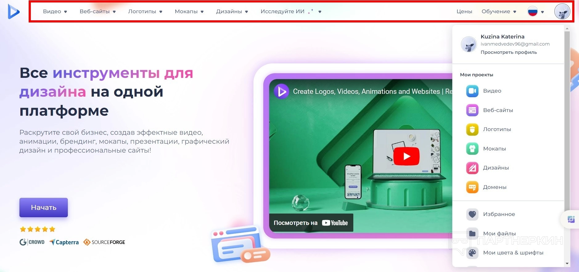 - Список инструментов сервиса: Видео, Веб-сайты, Логотипы, Мокапы, Дизайны, Искусственный интеллект.