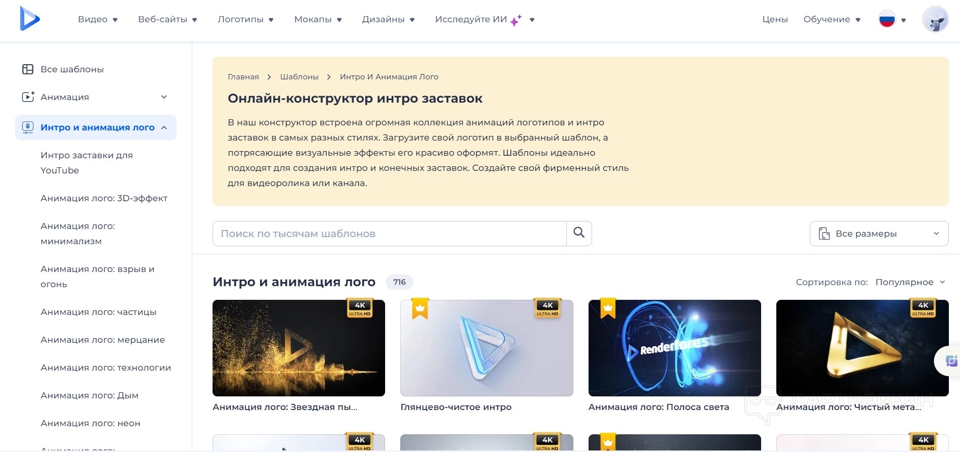 - Онлайн-конструктор интро заставок. Включает в себя огромную коллекцию анимаций логотипов и заставок в самых разных стилях. Пользователи могут загрузить свой логотип в выбранный шаблон, и система автоматически применит потрясающие визуальные эффекты для его оформления. Эти шаблоны идеально подходят для создания как интро, так и конечных заставок, позволяя разработать фирменный стиль для видеороликов или канала.