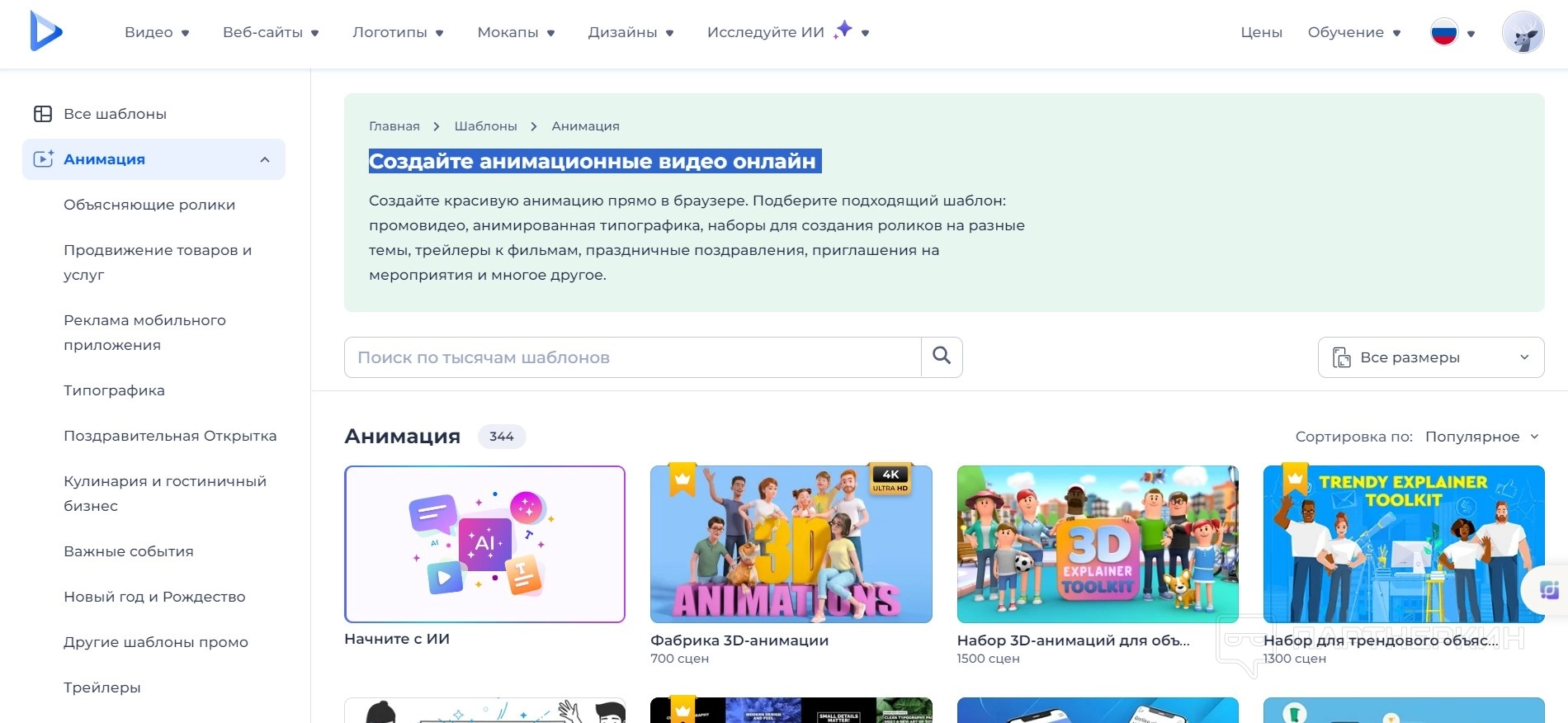 - Анимация. Создание красивой анимации прямо в браузере, без необходимости устанавливать дополнительное программное обеспечение. Пользователи могут выбрать подходящий шаблон из широкой коллекции, включая промовидео, анимированную типографику, наборы для создания тематических роликов, трейлеры к фильмам, праздничные поздравления, приглашения на мероприятия и многое другое.