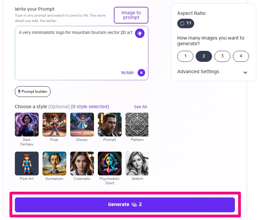 После ввода промпта и выбора нужных параметров необходимо нажать на большую кнопку «Generate», дождаться окончания генерации и выбрать между представленными вариантами: