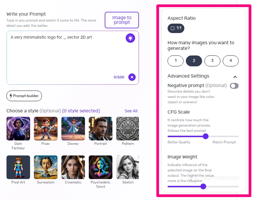 В правой части экрана расположены кнопки, с помощью которых можно регулировать такие параметры генерации, как соотношение сторон, количество одновременно генерируемых вариантов иконки, а также есть возможность добавить негативный промпт для большего контроля над результатами генерации.