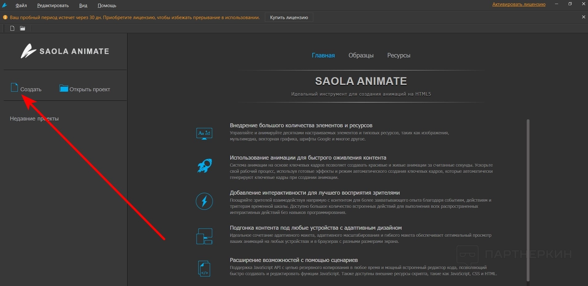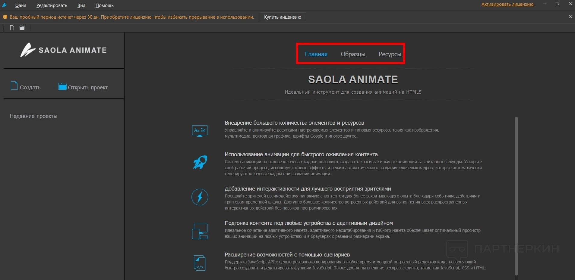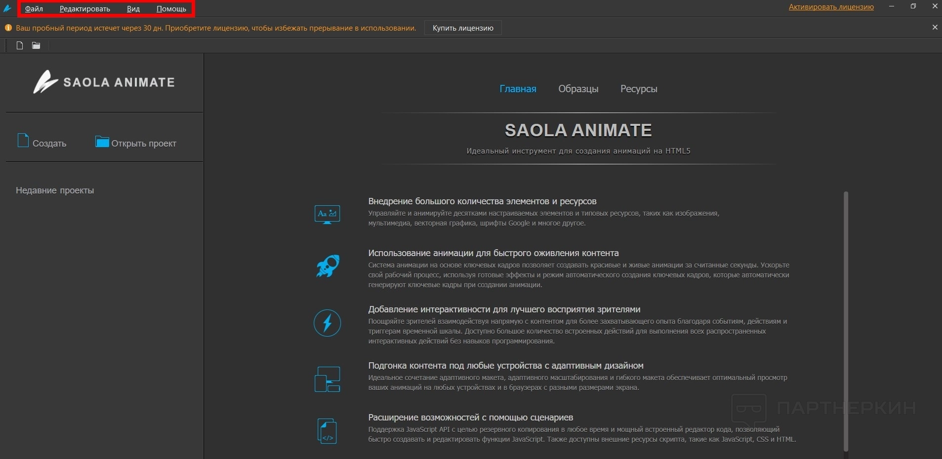 - Боковое меню. Тут только два элемента: создать или открыть проект. Также есть недавно созданные проекты.