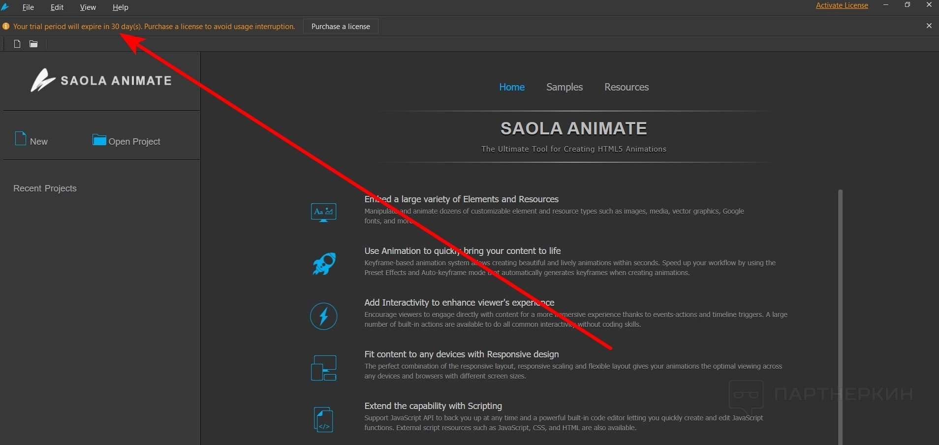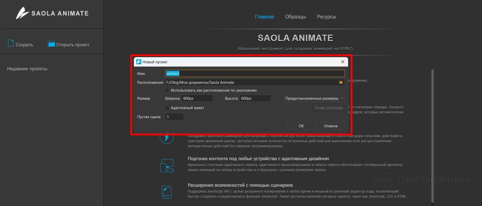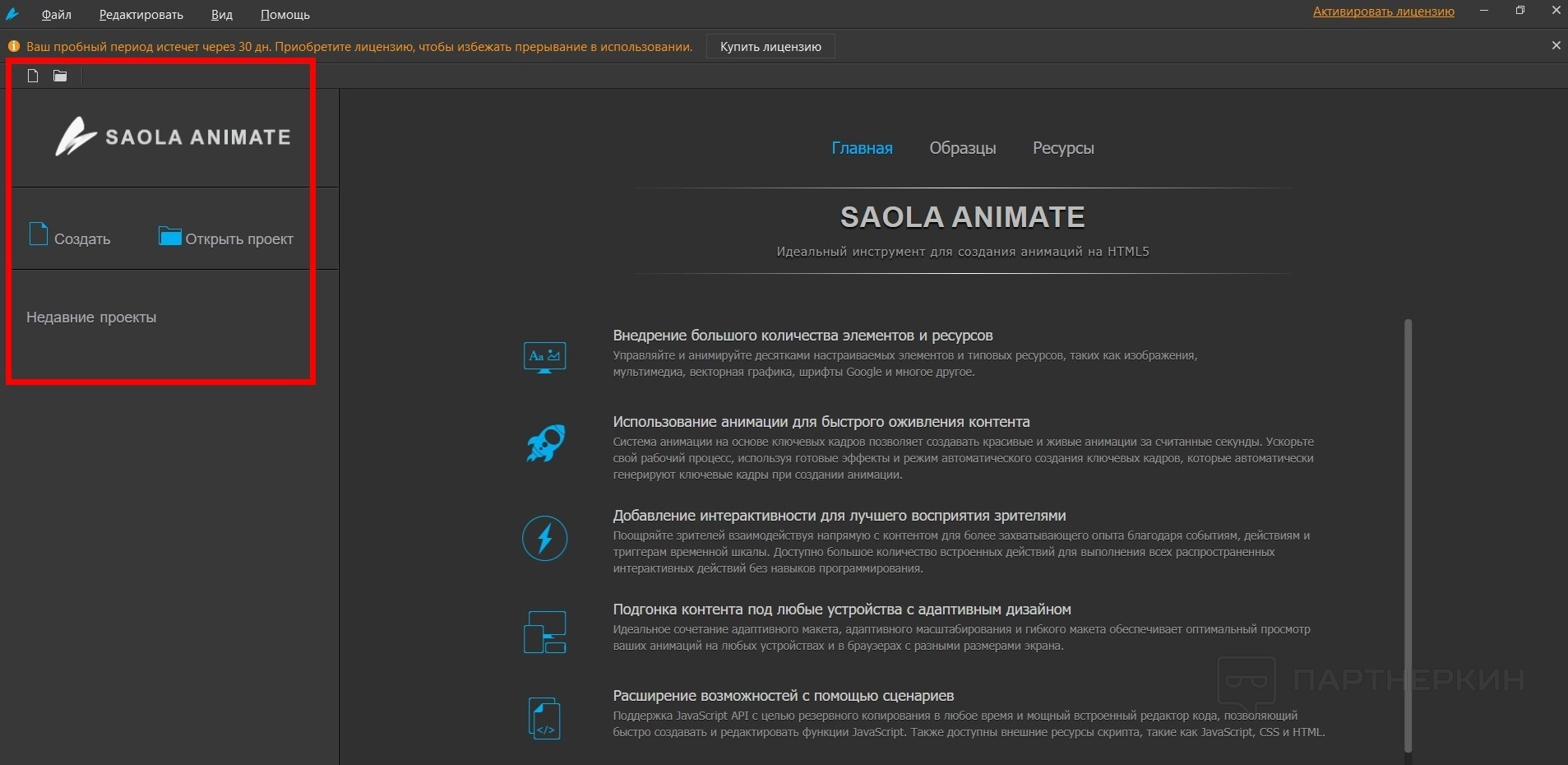 - Боковое меню. Тут только два элемента: создать или открыть проект. Также есть недавно созданные проекты.