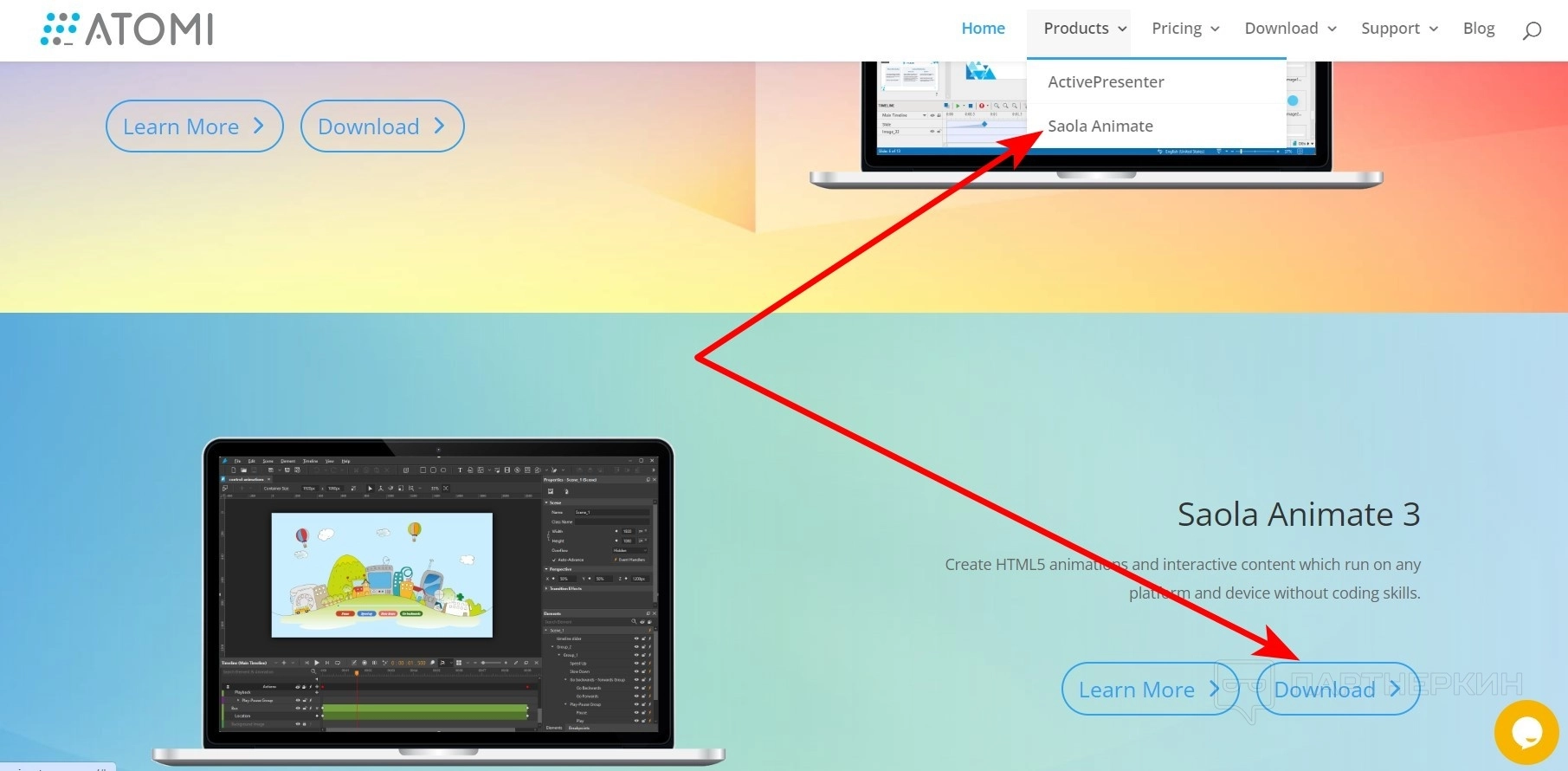 - На главной странице сайта выберите Download или во вкладке Product раздел Saola Animate .