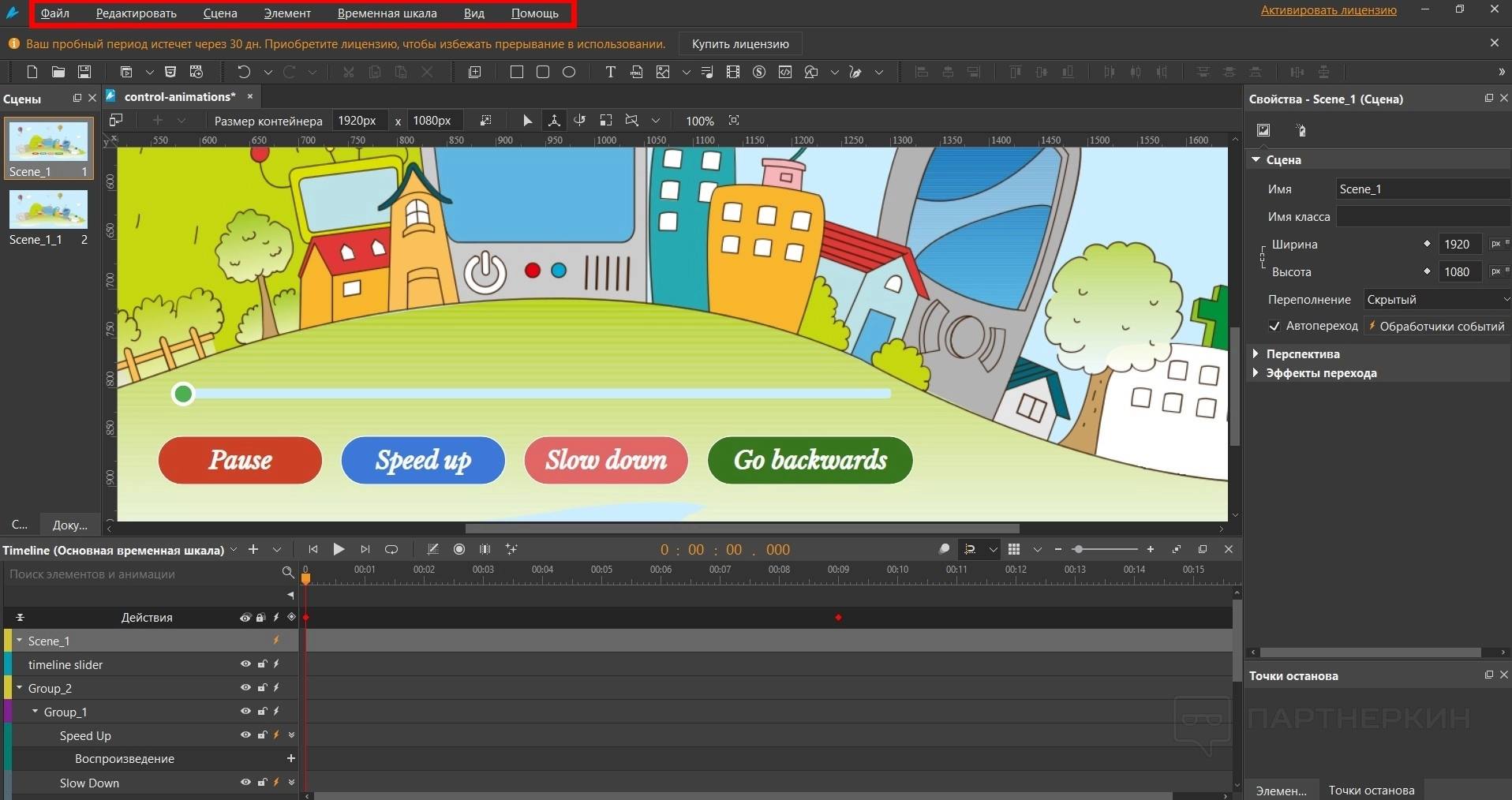 - Сцены. Похожи на слайды из PowerPoint. Инструмент помогает разделять контент и управлять потоком анимации.