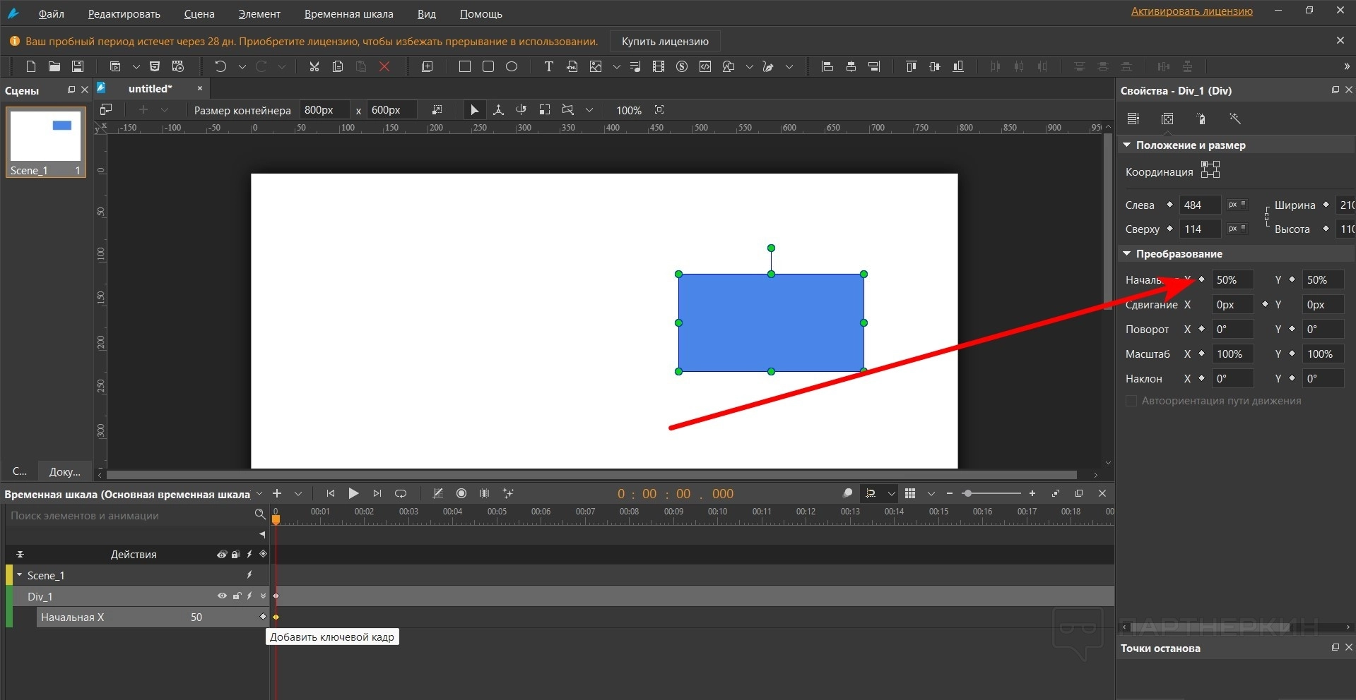- Щелкните ромб напротив нужного эффекта. В нашем случае это начальная X. Можно изменить значение свойства для этого кадра по своему усмотрению.