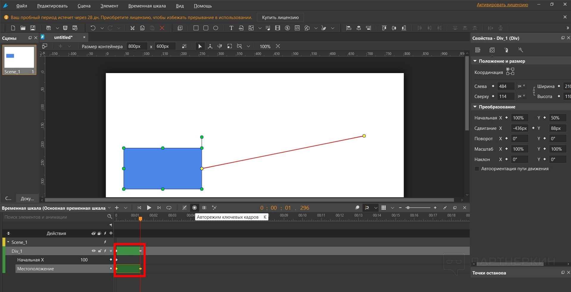 - Выключите авторежим ключевых кадров. В таймлайне выставите нужную длину ролика.