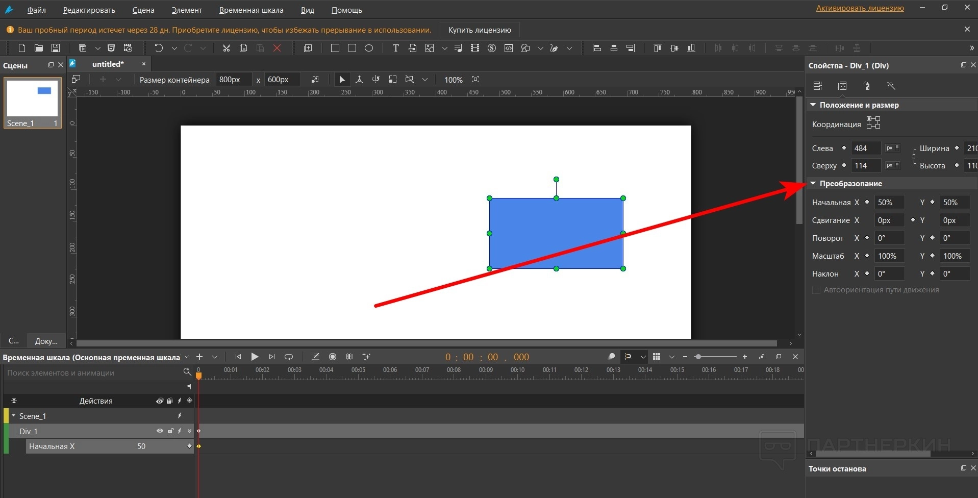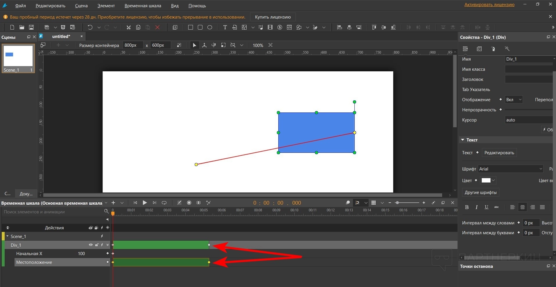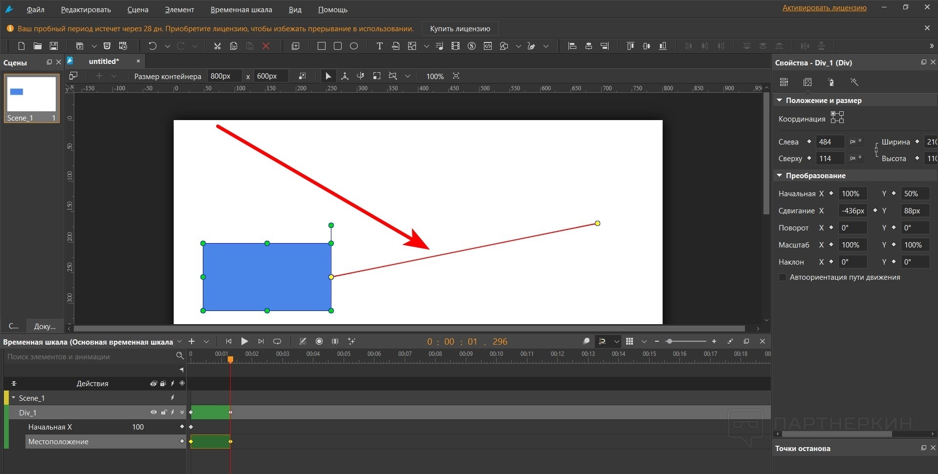 - Переместите объект туда, где нужно закончить анимацию. Появится красная линия. Это направляющая, по которой будет двигаться объект. Ее можно менять по своему усмотрению. Все зависит от того, как нужно передвигать объект.