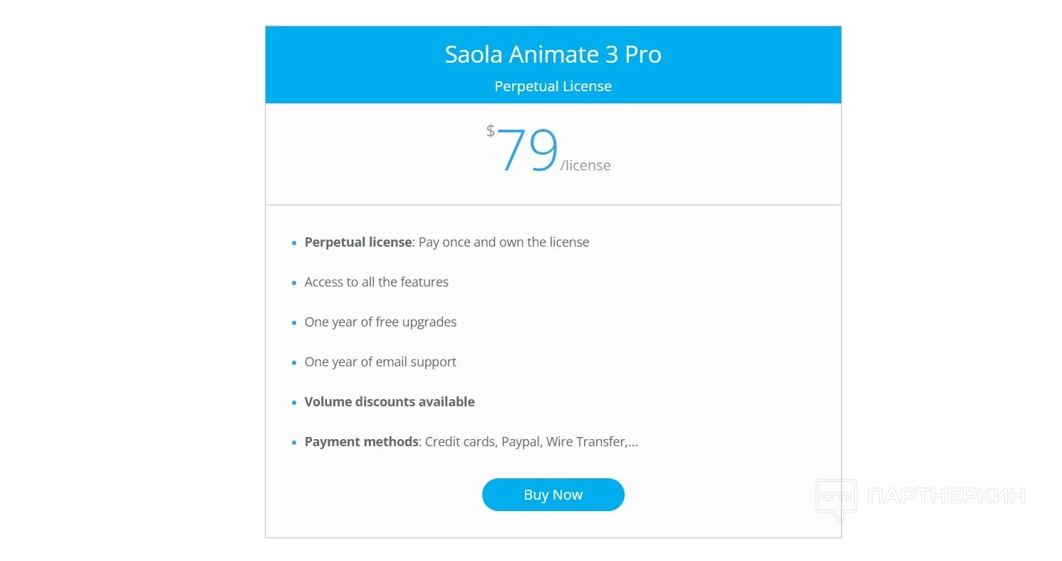 Saola Animate Pro предлагает бессрочную лицензию по цене $79. Это означает, что, заплатив один раз, пользователь получает постоянное право на использование программы.
